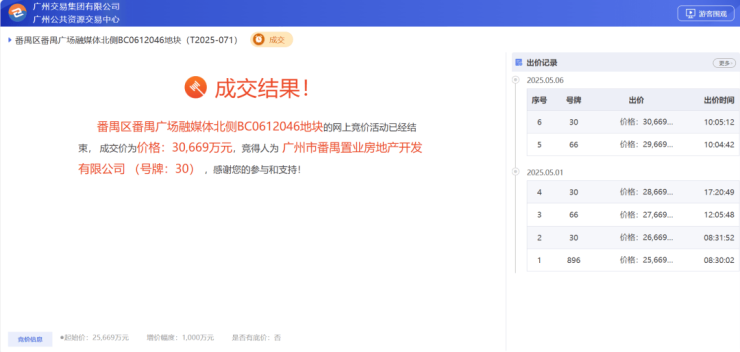 作为番禺区府旁的重量级宅地,地块今年5月土拍时,一度被3家房企争抢。(戳回顾),最终被番禺置业30669万元总价拿下。