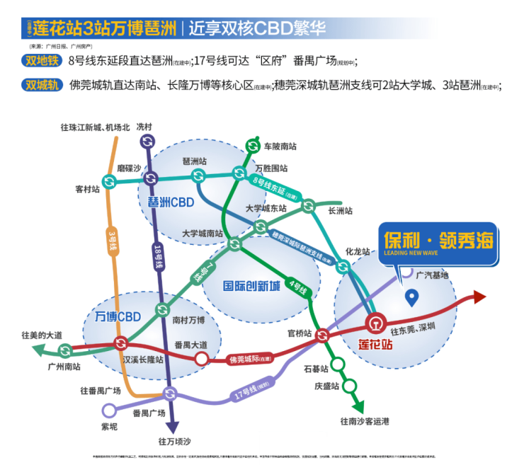 有一个莲花山站,城轨加地铁。城轨已经通车,从肇庆到惠州跨五城城轨。地铁8号线东延线还没有那么快开通,以及在建设的琶洲支线。不过项目距离莲花山站2.8公里,需要开一个电动车或者搭乘楼下的公交一个站到达。