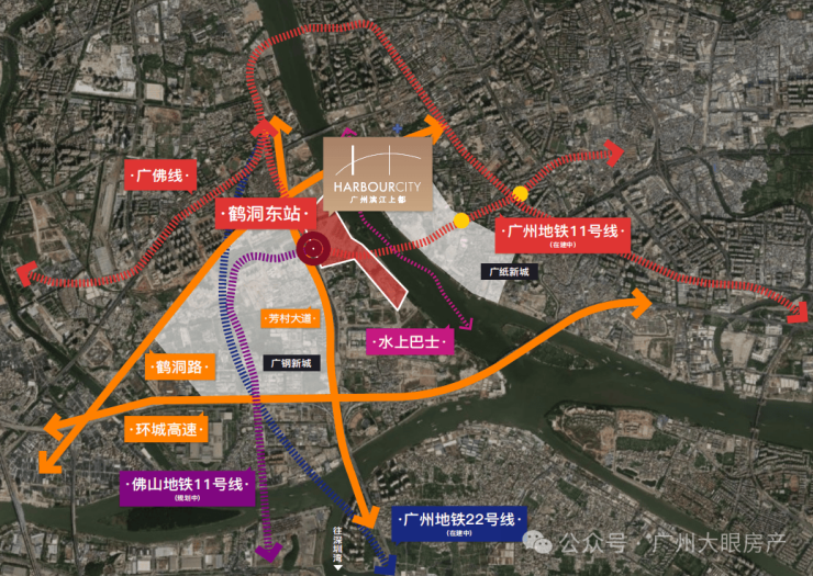广州11号线鹤洞东站地铁上盖,拥有3横2纵大路网+公交站场+水上巴士,集水、陆、轨等多维交通方式于一体,半小时城央生活圈,1小时湾区生活圈。