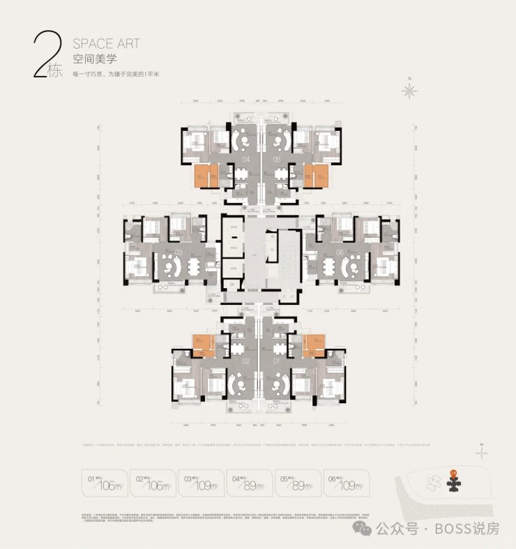 其中主要在售是2座,其他楼栋剩余部分尾货,小面积三房已经完全没有房源,主要剩下南向的106/109平和少量123平