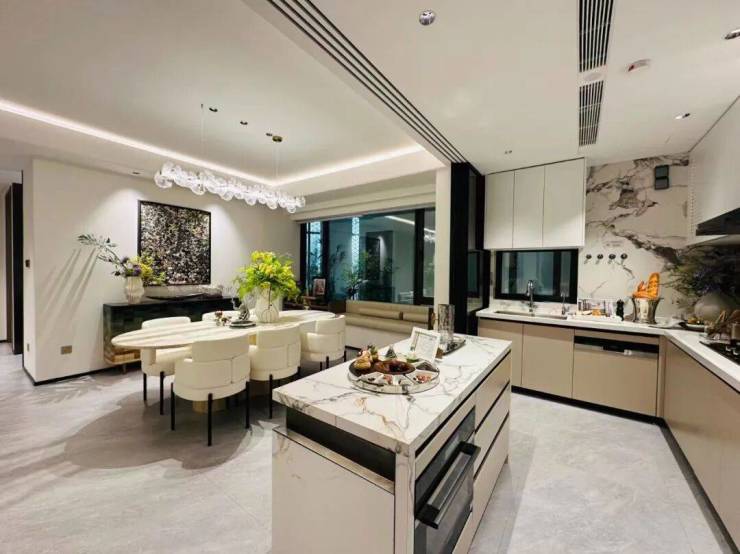 样板间展示的是打了一个房间并入客厅,加上6米的宽阳台和客厨一体化,显得整个客餐厅空间很大,采光面十足。