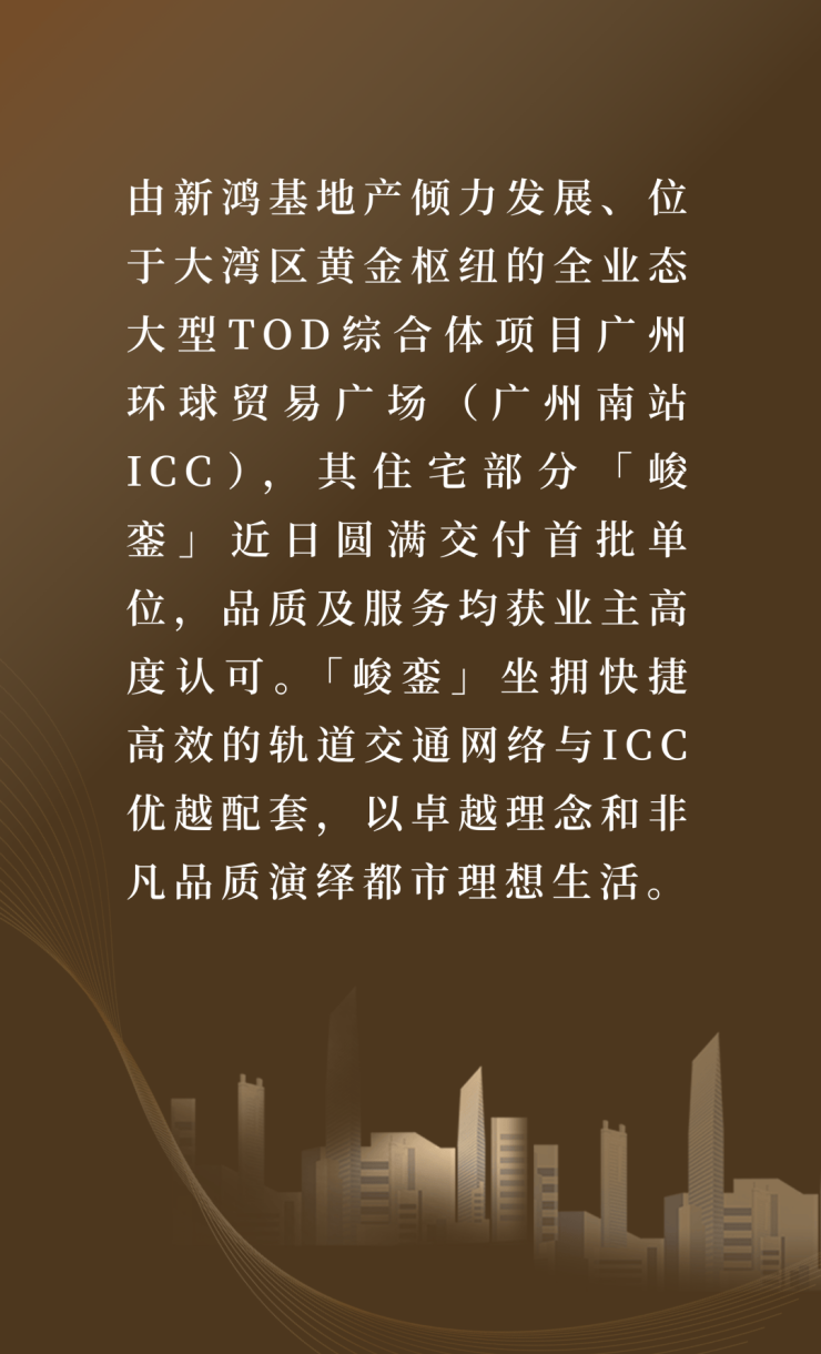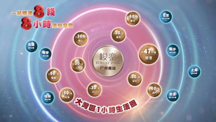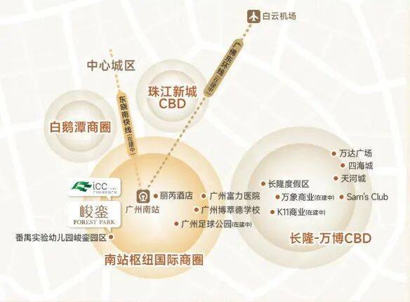 对标「香港ICC」前沿规划理念,「广州南站ICC」将高端商场、顶级写字楼、星级酒店、公寓及品质住宅「峻銮」等业态融为一体,通过连廊连接高铁站,实现“站城一体”。未来,旅客可体验“行李箱未放、购物已开始”的全新消费场景,住户亦可体验“工作-生活-休闲”三位一体的生活场景。从广州南站出发,串联起万博CBD、长隆文旅区与广州足球公园的「万长南黄金十公里走廊」,以“轨交+地标+产业”的独特模式,正快速重塑湾区的价值版图,构建满足不同客户消费需求的都市生活圈。