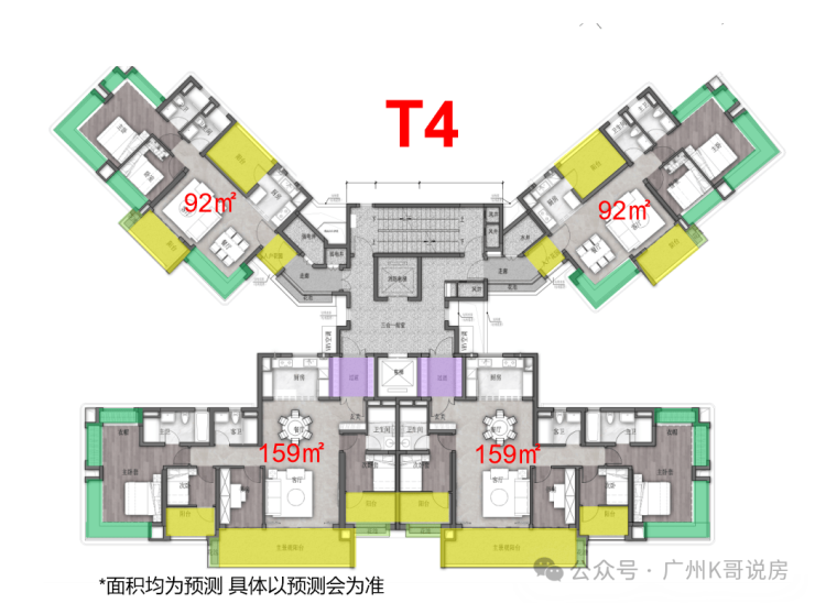 2号楼,两梯四户,总层高47层,面积有92-159方两种户型。