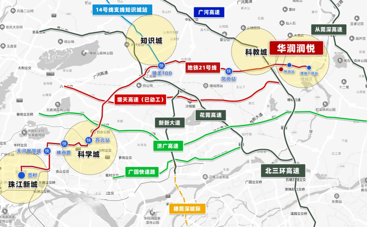 项目地处21号线山田地铁站与钟岗地铁站中间,距离都2公里左右,走路基本要半个小时,很明显的不现实,最好的骑个电动车接驳,家门口3000㎡润悦花园公交首末站,接驳地铁,坐地铁一个站到增城广场站换快线,5个站就可以到天河。