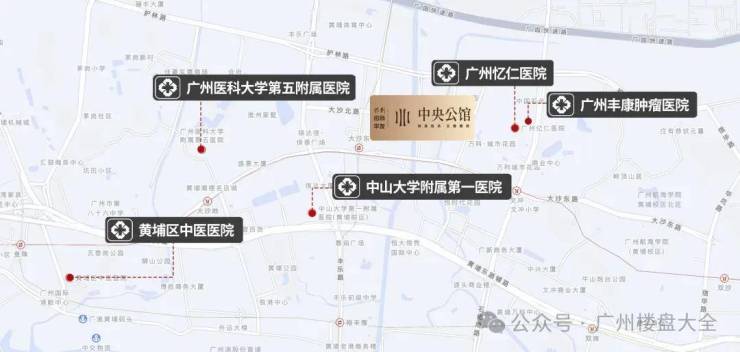 4、医疗:项目位于黄埔老区府位置,附近几所三甲医院中大附属第一医院(三甲),广医大附属第五医院(三甲)、黄埔区中医医院、广州市黄埔区妇幼保健院等,都在2公里之内。