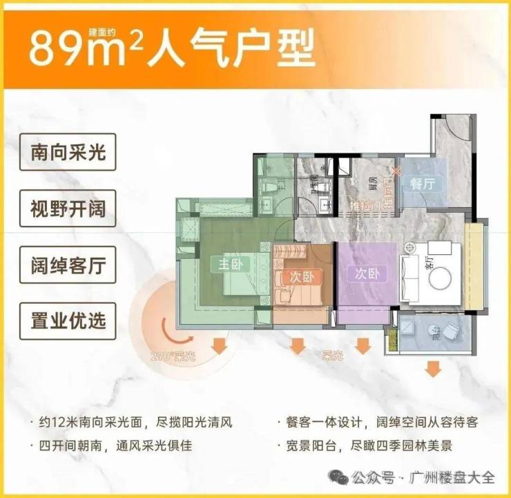 建面89㎡户型,四开间朝南,入户花园大,270°飘窗,独立主卫。7栋有3条梯腿,东南/西南。