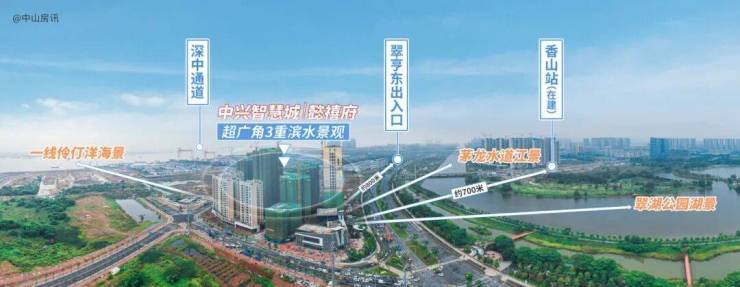 项目距深中通道翠亨东出入口约800米,紧邻建设中的南中城际香山站。南中城际香山站与项目楼下的翠湖公园组成“一湖一站”的TOD综合体。