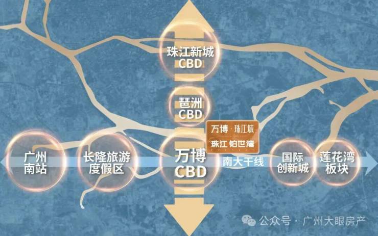 项目地处广州城市中轴&南大干线经济带双中轴交汇点——万博核心,南北CBD塔尖资源一脉尽享。