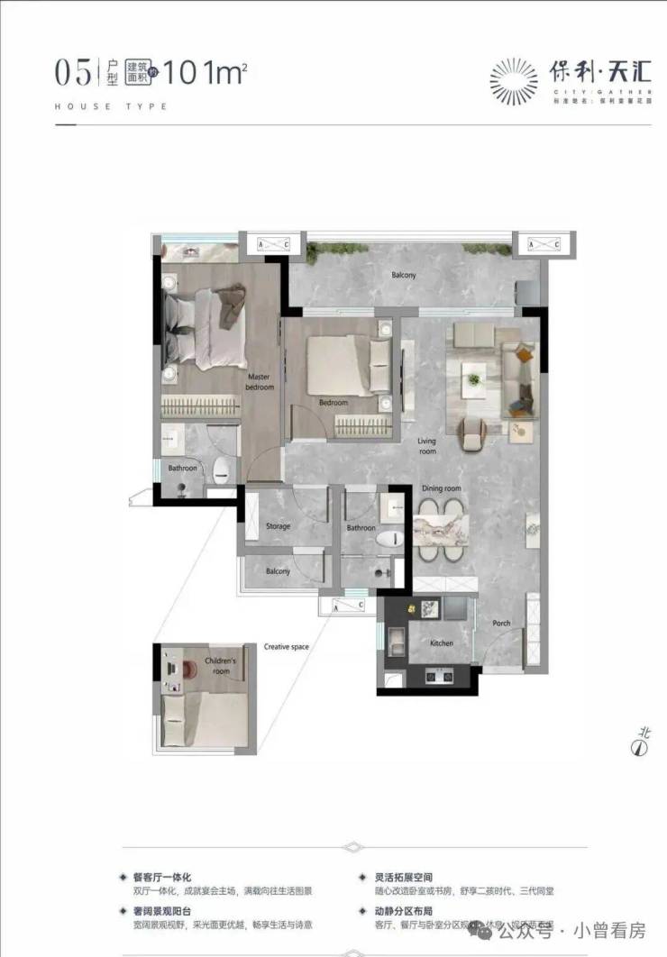 作为天河智谷的核心大盘,保利天汇依托天河、金融城、琶洲三大核心产业区,享受周边2500家高新企业、25万高精尖人才的产业红利。项目内部配备熊猫主题乐园、无边际泳池、酒店式入户大堂、风情商业街等高端配套,打造集文化、休闲、社交于一体的高品质居住社区。同时,五期紧靠奥体山体公园(规划中),部分单位可推窗见绿,享受更优质的景观资源。