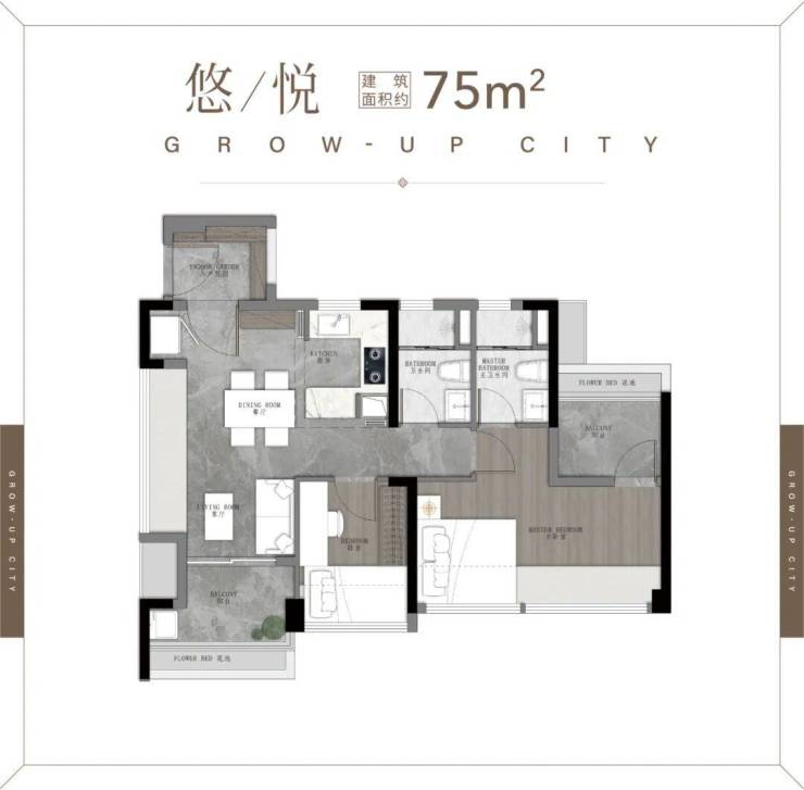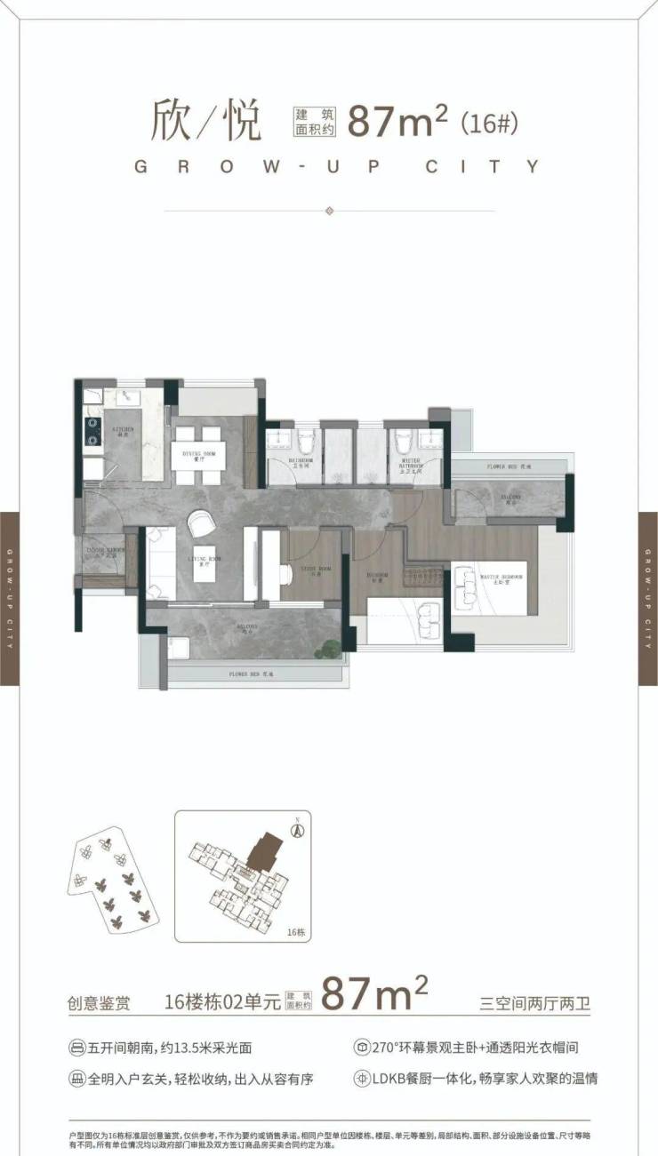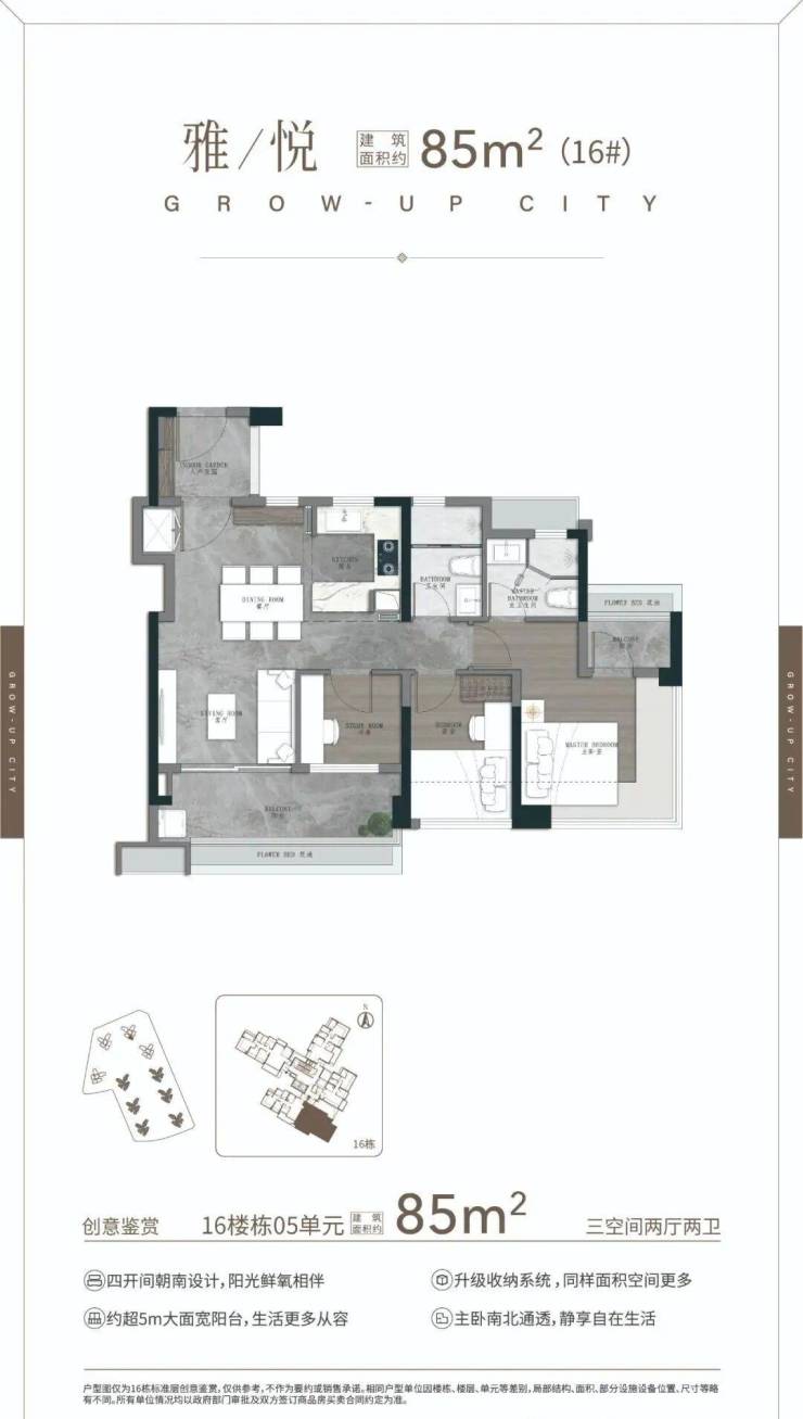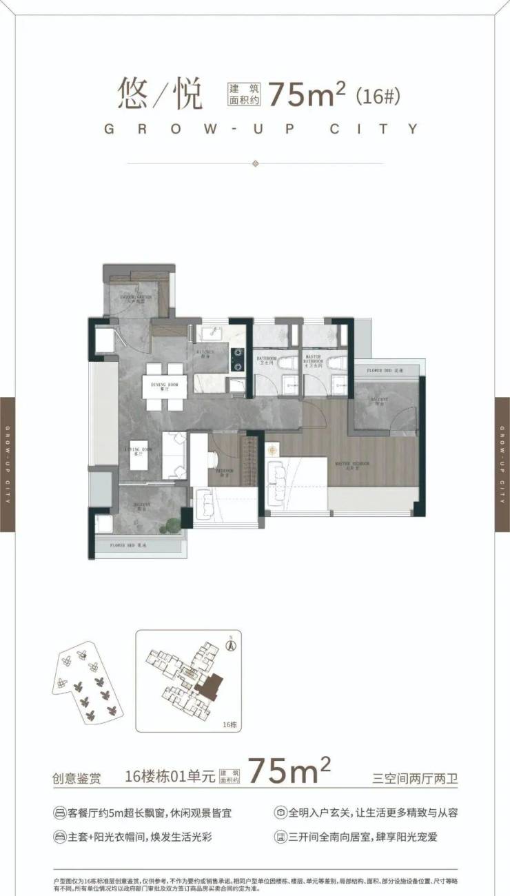 75㎡三空间两卫,年轻人主城上车首选 ,四开间朝南 全明转角玄关 开放式厨房,开阔景观阳台 南北对流主套&衣帽间。