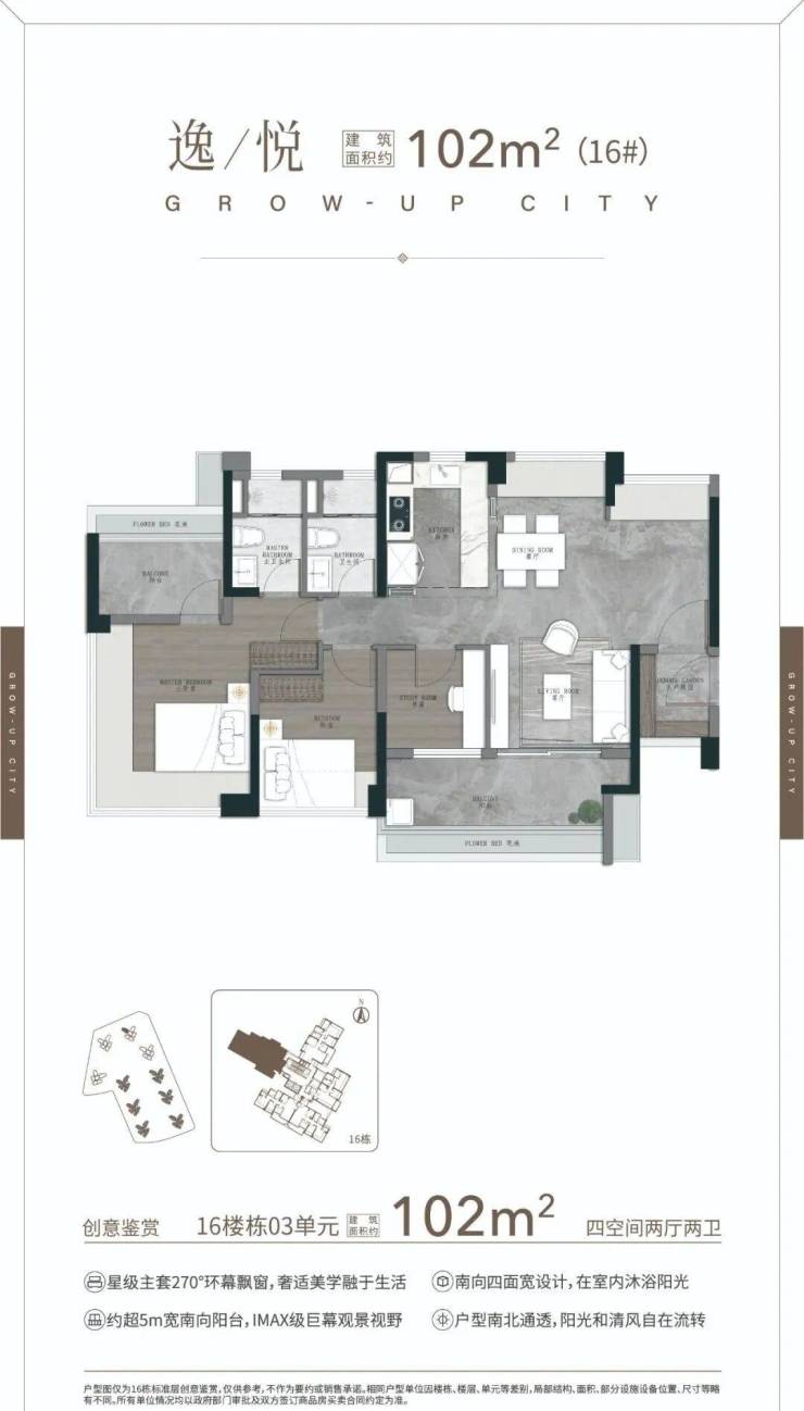 103㎡四空间两卫,三代同堂换房必看,阳光入户 五开间约14m采光 开放式厨房,270℃无立柱转角阳台 阳光梳妆台&衣帽间。