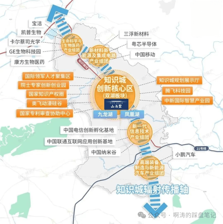 产业布局:投资数千亿,以“一核一轴四组团”布局已汇聚阿里巴巴、GE生物、西门子等全球500强高知经济龙头,粤芯、百济神州、百度Apollo等165个重大项目