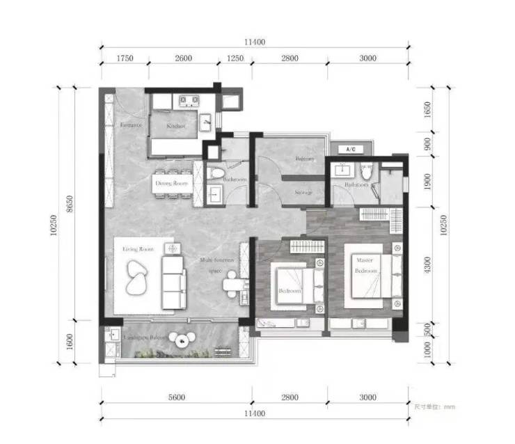 两条梯腿均为东南朝向,客厅做到了5.6米开间,远比一般竖厅的客厅开间舒服,此外做到了南向三面宽,次阳台可改房等等。