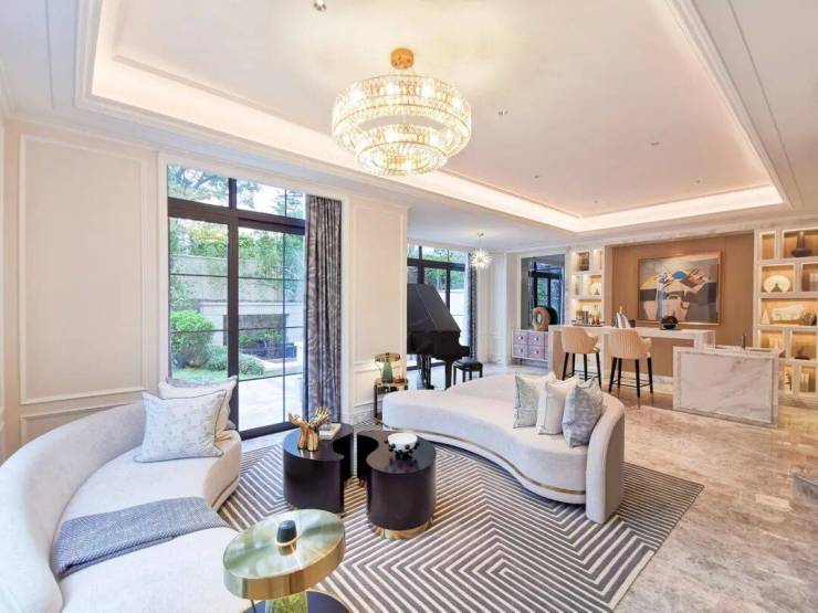 轻奢软饰增强空间呼吸性,深邃格调提升艺术气息。艺术吊灯、典雅陈设、清新原木、奢华石材,深浅呼应的软硬搭配,以爱马仕为主加深蓝点缀,简雅大气而不显沉重。