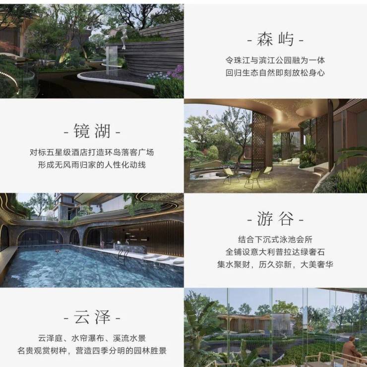 蓝调国际大师主笔,“溯源”广州在地文化,以珠江为源头,溯流而上,从外到内匠心打造:森屿、镜湖、游谷、云泽“四重景观礼序”,塑造优雅归家动线。