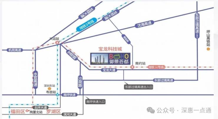京基御景荟都,位于龙岗区碧新路与宝荷路交汇处,东侧200米是已经开通运营的14号地铁线“南约站”,碧新路东侧是宝龙科技城;宝荷路一路之隔对面是比亚迪以及正在建设中的宝龙生物药创新发展先导区,西侧是已经成熟的居民区(仁恒峦山美地,卓弘高尔夫雅苑,振业峦山谷等)