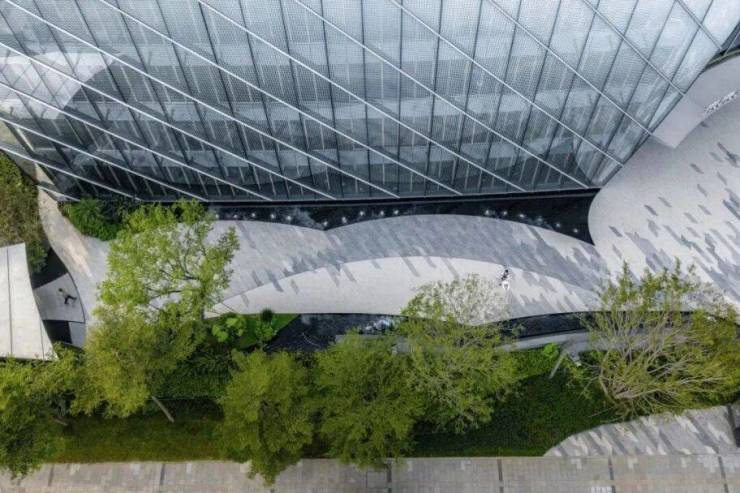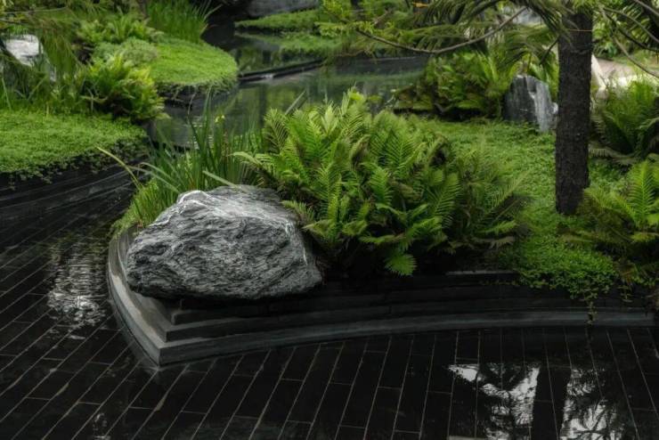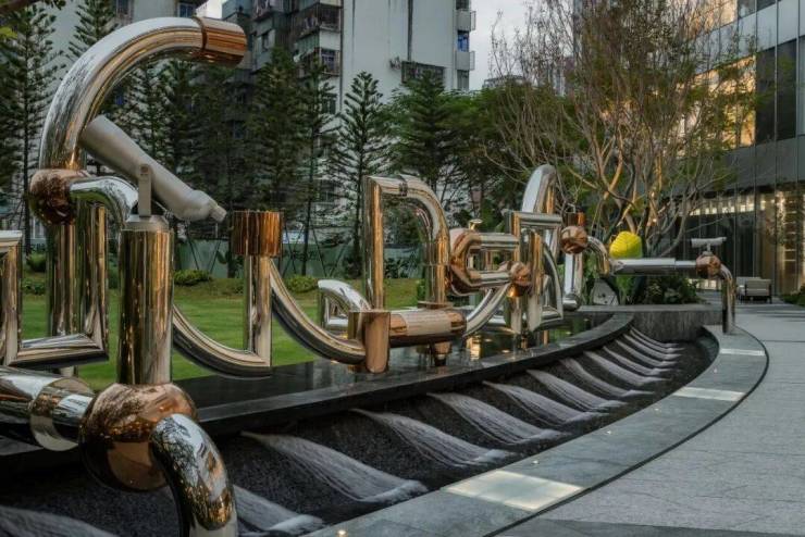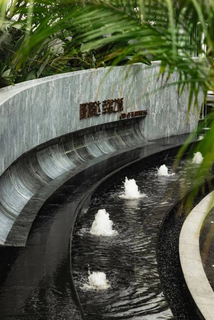 入口处的跌水景与特色艺术装置相映成趣。水景如潮汐般律动变化,共同形成吸引人驻足、汇聚的视觉焦点。