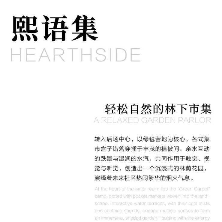 营销中心景观设计以灵动的布局,巧妙兼顾展示功能与社交、游逛、休憩等多元公共需求,充分利用场地特征,衍生出三大主题市集空间:「帆潮起」(潮涌集)、「生活感」(熙语集)、「山林间」(双山集),由此开启未来理想生活的全景体验。