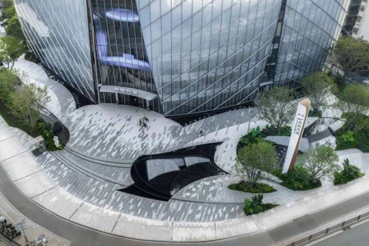 铺装以菱形石材为基础,通过渐变的视觉效果模拟浪涌向前的动感。经过多次材料测试,我们精细控制了石材的色泽过渡,确保最终呈现的韵律感。