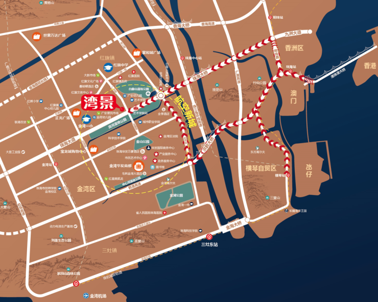 湾景位于珠海东西主动脉珠海大道上,驾车快速直通横琴口岸和澳门、港珠澳大桥珠海口岸和香港,5-8公里内即是广佛江珠高速和珠海机场高速,8公里内有未来珠江口西岸的高铁枢纽鹤洲珠海中心站连接广州深圳肇庆等湾区城市,距珠海机场直线距离仅14公里……在空港、高速快速公路、高铁、城轨组成的高效立体交通网中,湾区价值极速交融,物业价值恒升就在眼前。