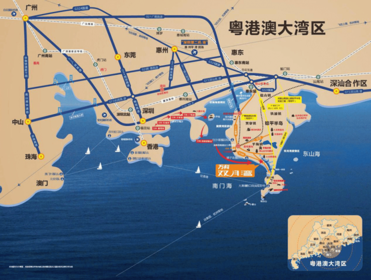 厦深高铁:已经通车的厦深高铁惠东站距项目25分钟,接驳广汕高铁、广深港高铁、赣深高铁,从惠东站去深圳北仅需30分钟,到广州40分钟,到香港西九龙站50分钟,实现广深港惠1小时生活圈。