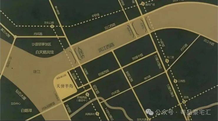 白鹅潭之上,望三江汇聚,仅此天誉半岛。天誉半岛位于海珠区滨江西岛尖位置,项目旁就是洲头咀公园,地处羊城八景之一的白鹅潭板块,西、北两面临江,西侧江边为滨江绿化带,北望白鹅潭、沙面。
