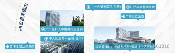 约5公里范围内多家三甲医院环绕:黄埔区中医医院(三甲,建设中),距离项目约500米,打造黄埔区首个国家级中医药领域示范高地;中大附属第一医院东院区(三甲);广州医科大学附属第五医院(三甲)等。