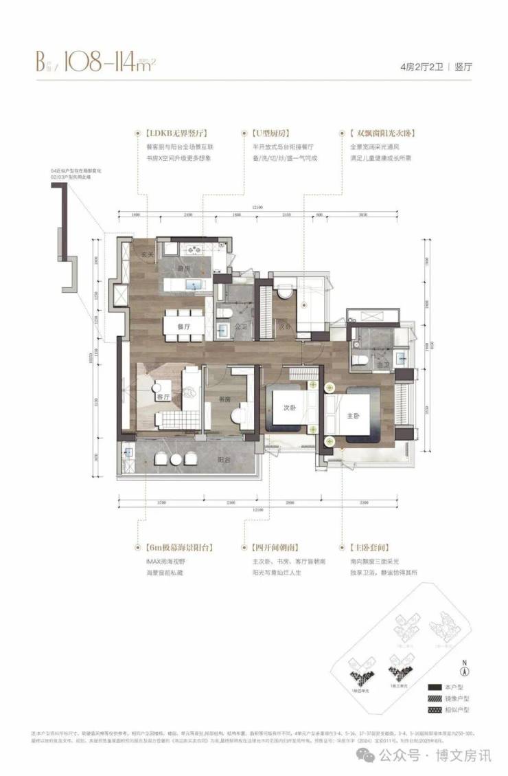 建面约108-143㎡海幕纯四房,臻藏级南向湾海视野,LDKB人性化动线设计,格局方正、高实用率,打造独立玄关、双飘窗主卧、步入式衣帽间等个性化空间。