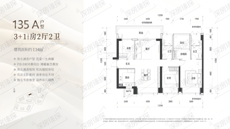 134㎡的4房2厅2卫,A户型(1栋1/2单元05户型),设计的是竖厅南北通透格局,进门入户玄关,客厅4.2米开间,LDKB一体化设计,四开间朝南,4个卧室分别做到了主卧19.44㎡/次卧10.64㎡/次卧10.26㎡/次卧7.8㎡(包含墙体飘窗),客厅连接次卧出6.8米长的观景大阳台看深大校区,U型厨房,卫生间干湿分离,得房率约90%(包含赠送),西北朝向。
