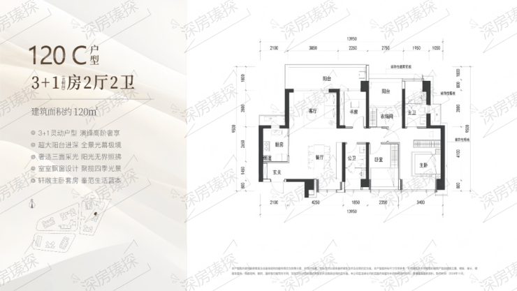 120㎡的4房2厅2卫,C户型(2栋3单元01户型),设计的是竖厅格局,客厅3.85米开间,LDKB一体化设计,动静分区,4个卧室分别做到了主卧16.65㎡/次卧9.9㎡/次卧9.16㎡/次卧6.3㎡(包含墙体飘窗),客厅连接次卧出6.1米长的宽景大阳台,U型厨房,卫生间干湿分离,得房率约90%(包含赠送),西北朝向。