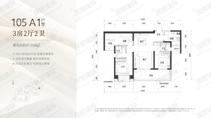104㎡的3房2厅2卫,A1户型(2栋3单元03户型),设计的是竖厅类双龙抱珠格局,客厅3.6米开间,客餐厅一体化设计,3个卧室分别做到了主卧12.8㎡/次卧12㎡/次卧8.7㎡(包含墙体飘窗),客厅连接次卧出6.5米长的宽景大阳台,U型厨房,公卫三段式分离,得房率约90%(包含赠送),东南朝向。