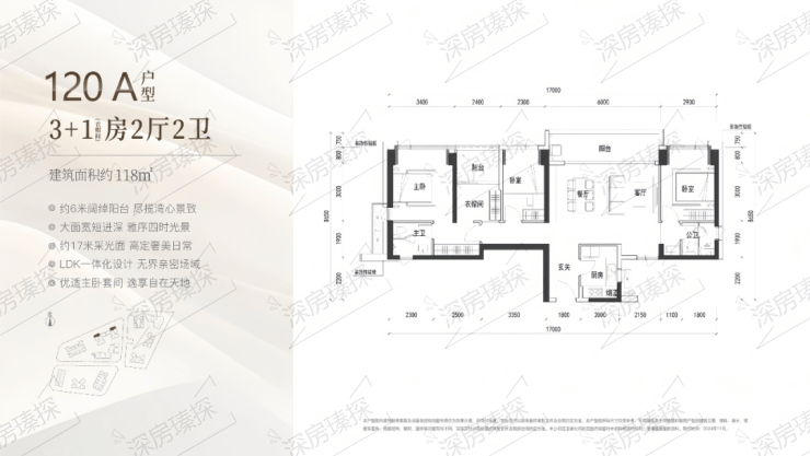 118㎡的4房2厅2卫,A户型(1栋1/2单元01户型),设计的是横厅格局,进门入户玄关,客餐厅6米开间,LDKB一体化设计,4个卧室分别做到了主卧17.65㎡/次卧11.02㎡/次卧9.12㎡/次卧8.74㎡(包含墙体飘窗),客餐厅出6米长的观景大阳台看深大校区,U型厨房,公卫三段式分离,得房率约90%(包含赠送),西北朝向。