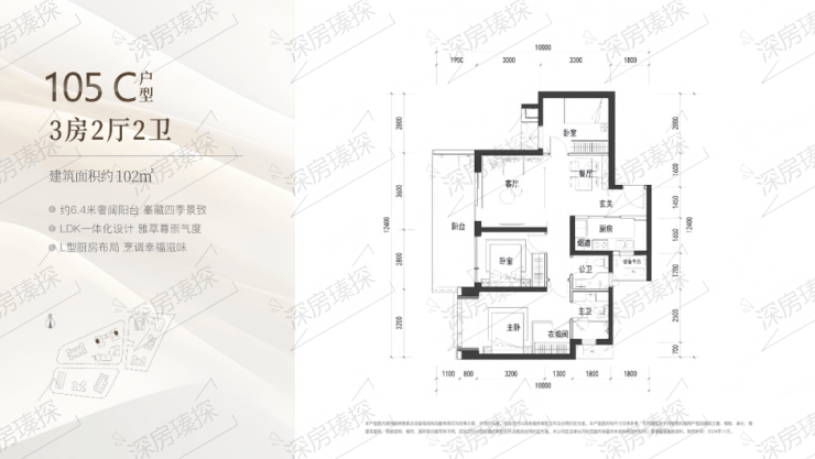 102㎡的3房2厅2卫,C户型(1栋1/2单元02户型),设计的是竖厅格局,客厅3.6米开间,LDK一体化设计,3个卧室分别做到了主卧16.93㎡/次卧9.24㎡/次卧8.96㎡(包含墙体飘窗),客厅连接次卧出6.4米长的宽景大阳台,U型厨房,卫生间干湿分离,得房率约90%(包含赠送),西南或东北朝向。