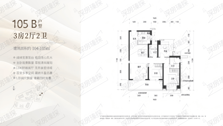 105㎡的3房2厅2卫,B户型(2栋3单元02/06户型),设计的是经典竖厅格局,客厅3.6米开间,LDKB一体化设计,三开间朝南,动静分区,3个卧室分别做到了主卧13.12㎡/次卧9.9㎡/次卧8.4㎡(包含墙体飘窗),客厅连接次卧出6.4米长的宽景大阳台,U型厨房,卫生间干湿分离,得房率约90%(包含赠送),正南或东南朝向。