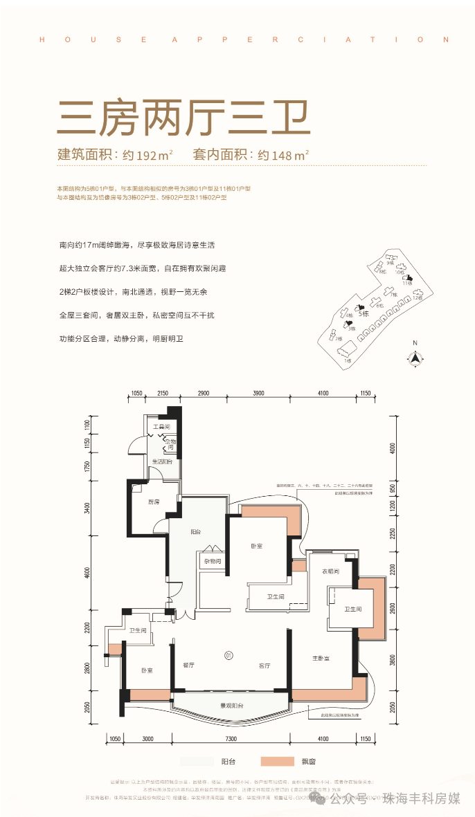 约7.3米面宽超大独立会客厅,大尺度尽享山海。2梯2户板楼设计,极悦尊贵私密体验。全屋三套间,奢居双主卧,私密空间互不打扰。功能分区合理,动静分离,明厨明卫。