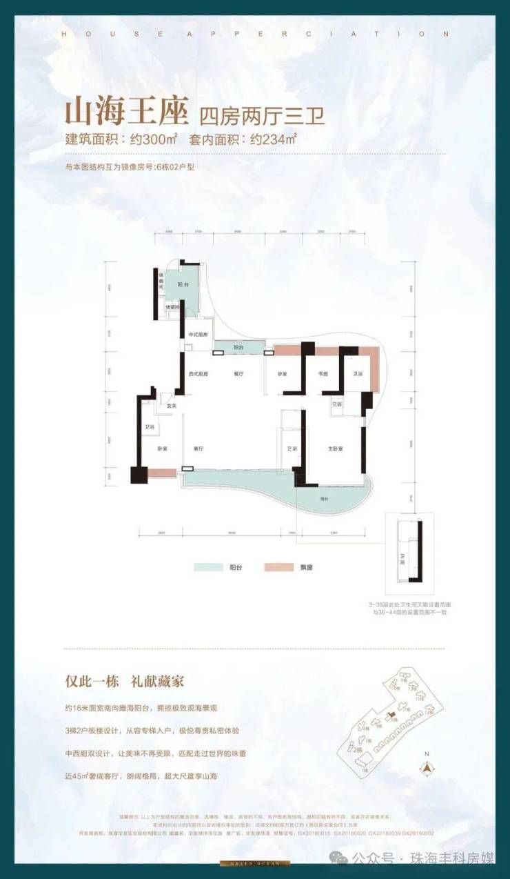 户型亮点:约16米面宽南向瞰海阳台,拥揽极致观海景观近45㎡奢阔客厅,朗阔格局,超大尺度享山海3梯2户板楼设计,从容专梯入户,极悦尊贵私密体验中西厨双设计,让美味不再受限,匹配走过世界的味蕾