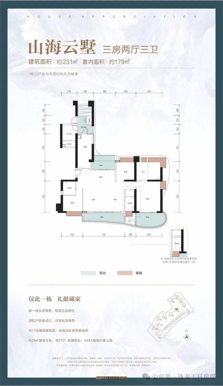 户型亮点:超一线头排海景,观海正央席位;约7.5米大面宽客厅,奢阔尺度尽显雍容风范;约38㎡星级主卧,带270°观景阳台,IMAX视角环幕山;2梯2户私家侯梯厅,尽享私密尊贵