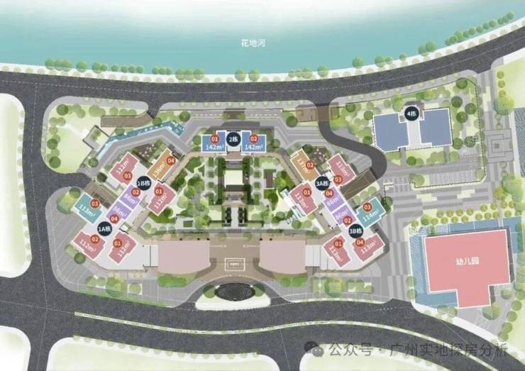 项目一共规划6栋,呈半包围梯形式排布,由1A栋、1B栋、3A栋、3B栋等四栋31-32层的高层洋房塔楼和2栋17层高、4栋5层高的小高层板楼等6栋住宅楼组成。