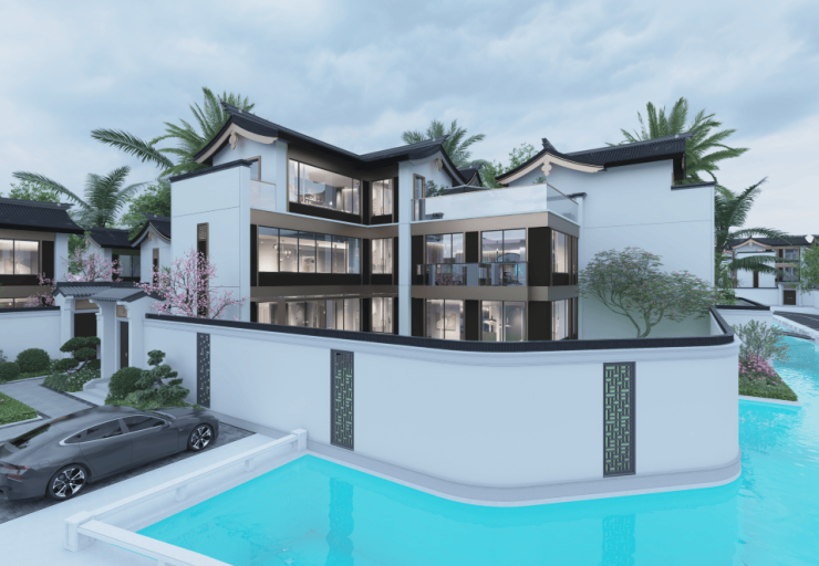 配套住宅采用现代新中式立面风格,以简洁且富有艺术感的设计,展现建筑特点和文化魅力。“新中式主义”将现代生活流线与传统建筑精髓相结合,既具现代感又保留东方的恢弘气质。外立面以白色涂料、浅色透明玻璃、深色平板瓦和铝合金为主要材料,呈现现代与传统相融合的美学。