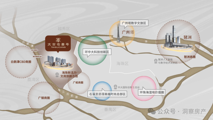 太古仓壹号坐拥老中轴延伸优势,串联白鹅潭商务区、聚龙湾综合体和太古仓文商旅圈,形成"水陆双循环"的顶级商圈格局。琶洲、白鹅潭、广钢、广纸等四大繁华商圈环绕,人文与艺术交相辉映,孕育全球前沿水岸生活的世界橱窗。