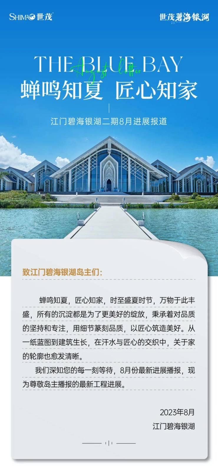 目前在江门碧海银湖公众号上,可查看每月的施工进展,比如在8月份,就通报了二期社区别墅92栋455户,分为1、2、3、4区进行进度管控。