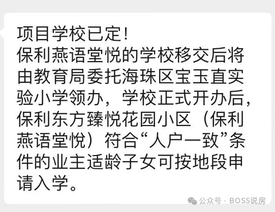 保利官宣了配建的24班小学,建好后将会移交将由教育局委托海珠区宝玉直实验小学领办,学校正式开办后,保利东方臻悦花园小区(保利燕语堂悅)符合“人户一致”条件的业主适龄子女可按地段申请入学。