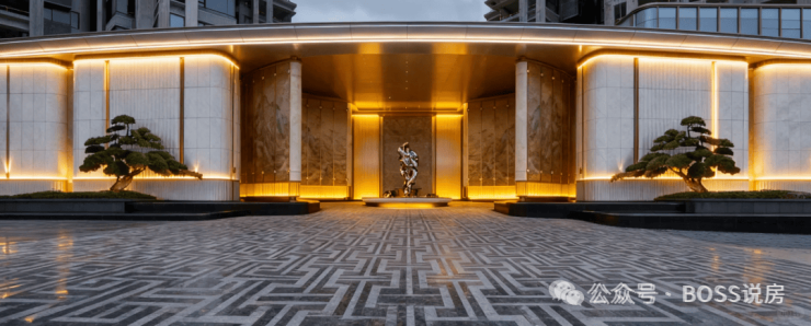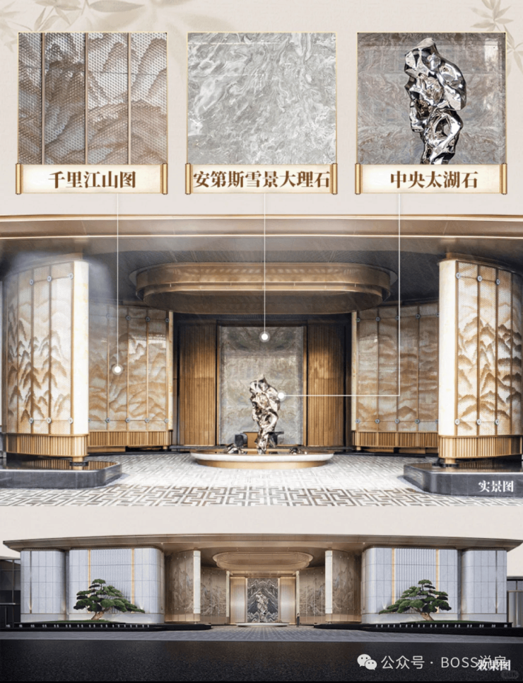 最近项目已经开放实景,项目有 60 米长、挑高 11 米的 "海珠西门王",采用雅博白大理石打造墙面,门头基座为巴西安第斯雪景大理石,门楼两侧的柱头采用宋汝窑青瓷装饰,还配置了凤鸟冠顶、飞檐翘角等设计,同时借助参数化技术将《千里江山图》铸就成流动金属画卷,彰显文化品味。