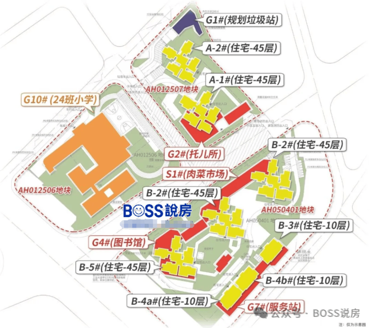 项目主要分为南北地块来规划,北地块规划了2栋超高层洋房,托儿所和24班宝玉直小学,南地块规划了3栋超高层洋房,2栋小高层板楼、和图书馆。