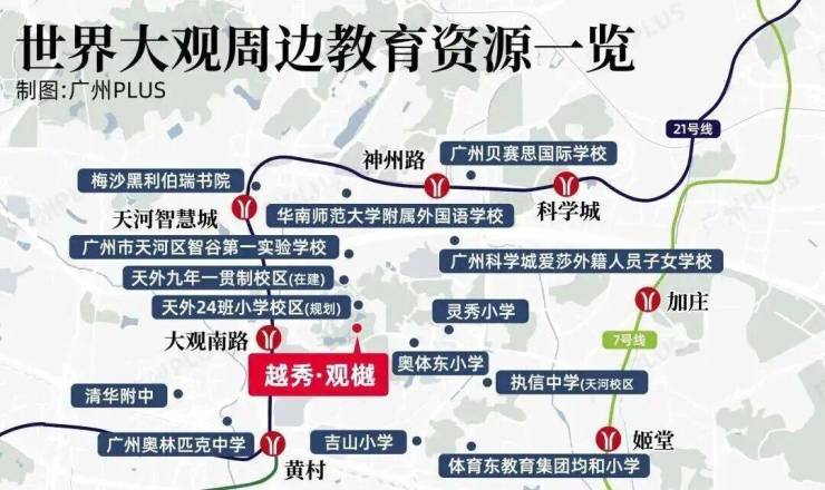 小学:配建 24 班小学,引进广州天河外国语教育集团合作办学,周边 3km 内有 15 个小学,包括奥体东小学、广州思源学校小学部等。