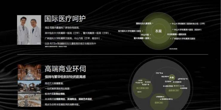 医院:周边 3km 范围内有 5 个一级及以上医院,周边覆盖 7 家综合性医院,包括三甲医院中大附属第一医院、暨大附属第一医院等,还有中山六院及 6.9 万㎡国际妇女儿童医院(规划中)