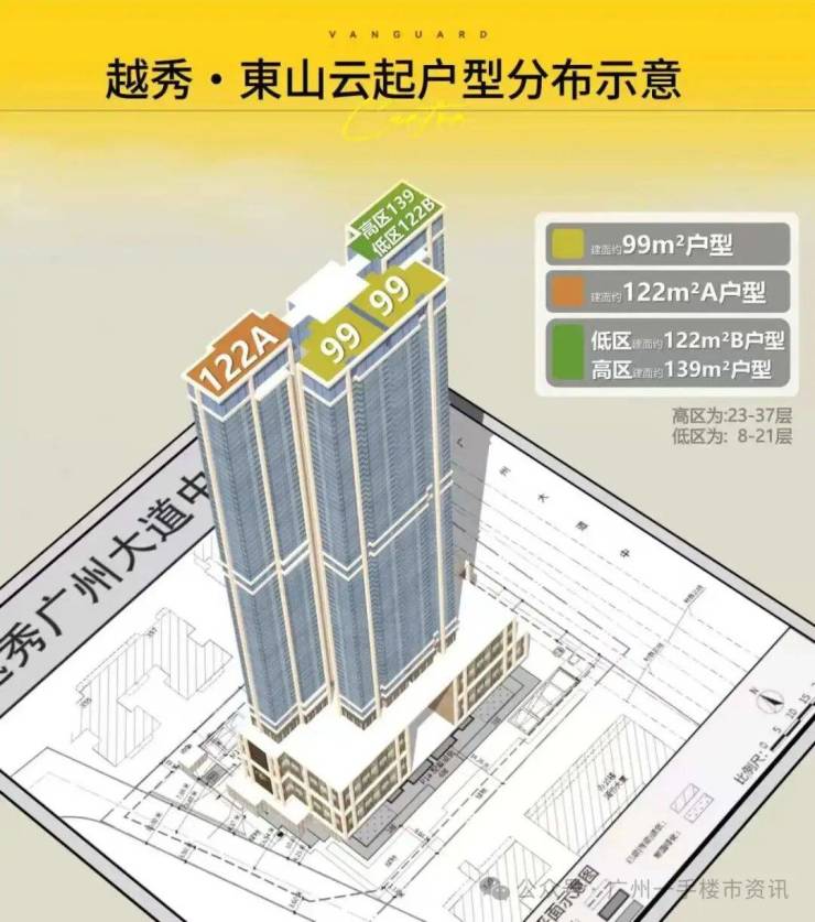 越秀东山云起项目总高37层,其中1-6层为配套设施,7层和22层为架空层,从8楼开始才是可售的住宅单位,项目周边基本都是楼龄比较旧的二手,所以这116套新规住宅注定会很抢手。