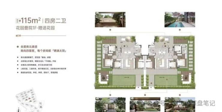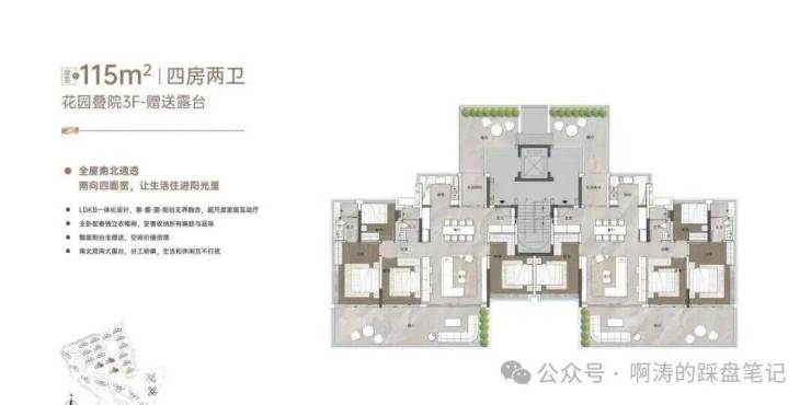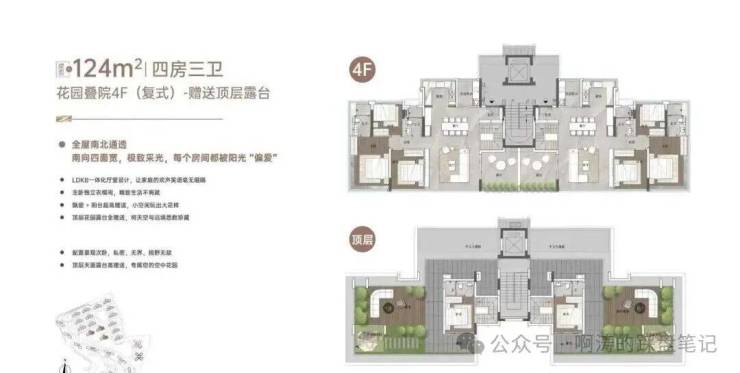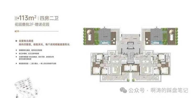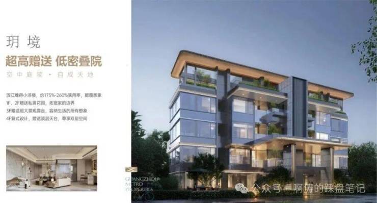 “玥境”为滨江小叠院,主打112-130㎡低密叠院,最大亮点是超高赠送率,1F、2F户型赠送私属花园,3F赠送超大景观露台,4F复式设计,赠送顶层天台。