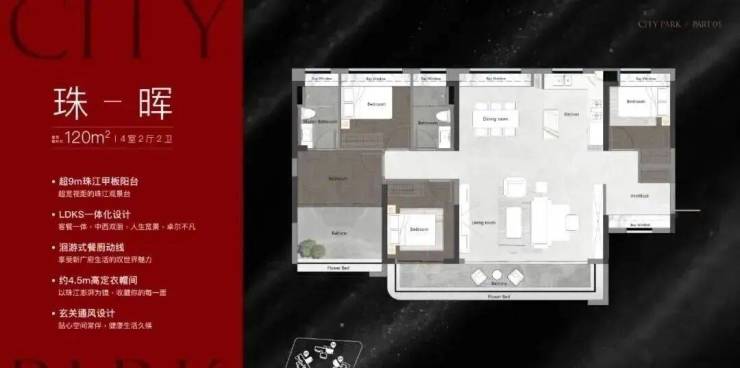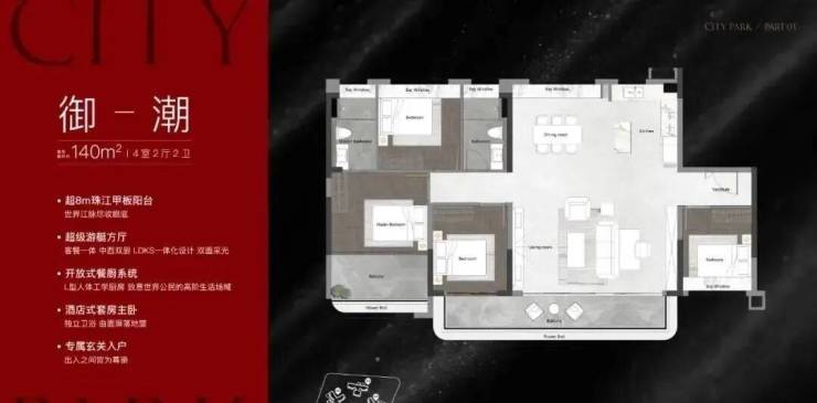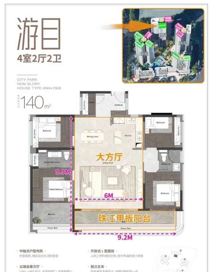 建面140平游目户型四房,是整个项目最中心的位置,南向高层可以望到珠江,此外还独自享受一个梯腿。