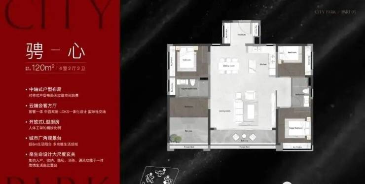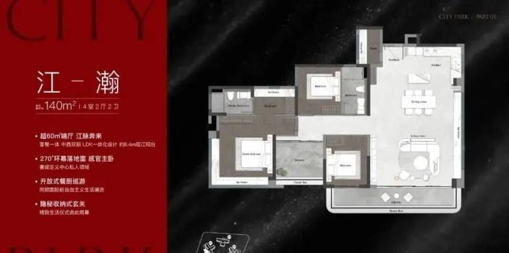 建面120平四房,和140平户型很像均是由大户型来衬托。